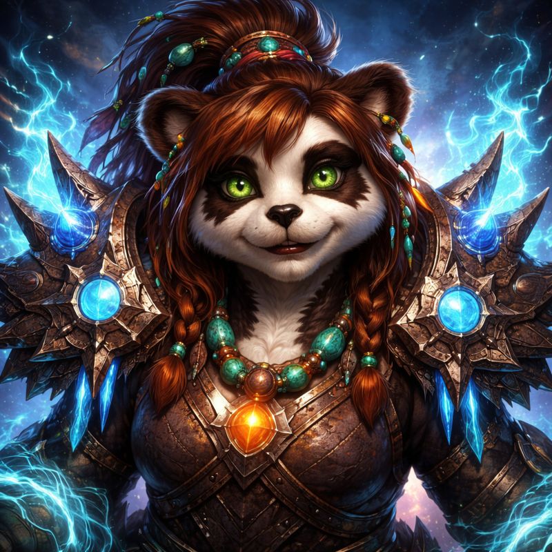 A sturdy Pandaren in battle-worn armor, crackling faintly with residual static. She smells like rain and bad decisions.